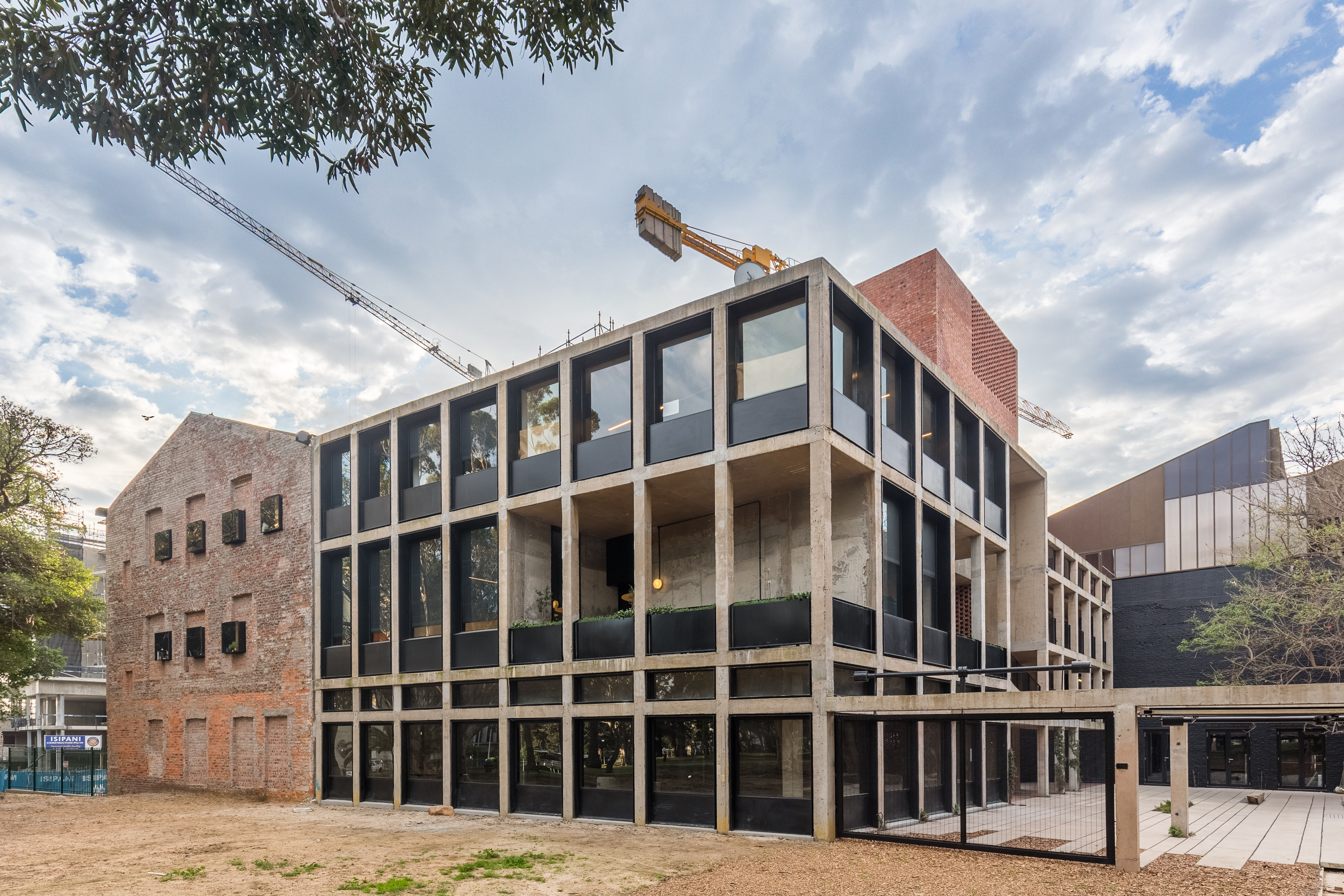 A proprietary window system was developed to highlight the contrast between the delicate and perfect nature of workshop-produced steel and the very rough concrete finish of the framework.